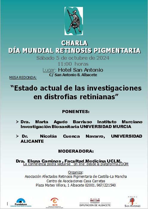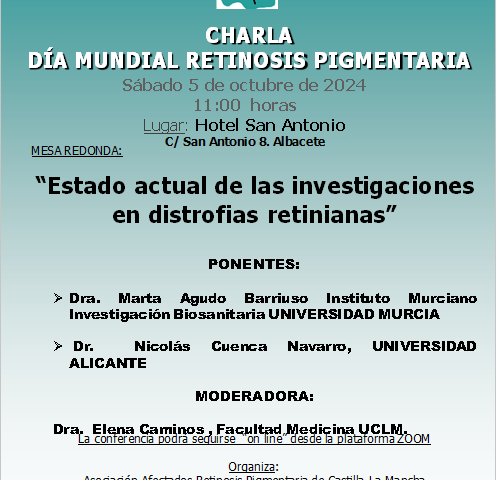 Publicamos esta noticia junto al cartel de la charla que se va a dar en Albacete por el día mundial de la Retinosis pigmentaria.