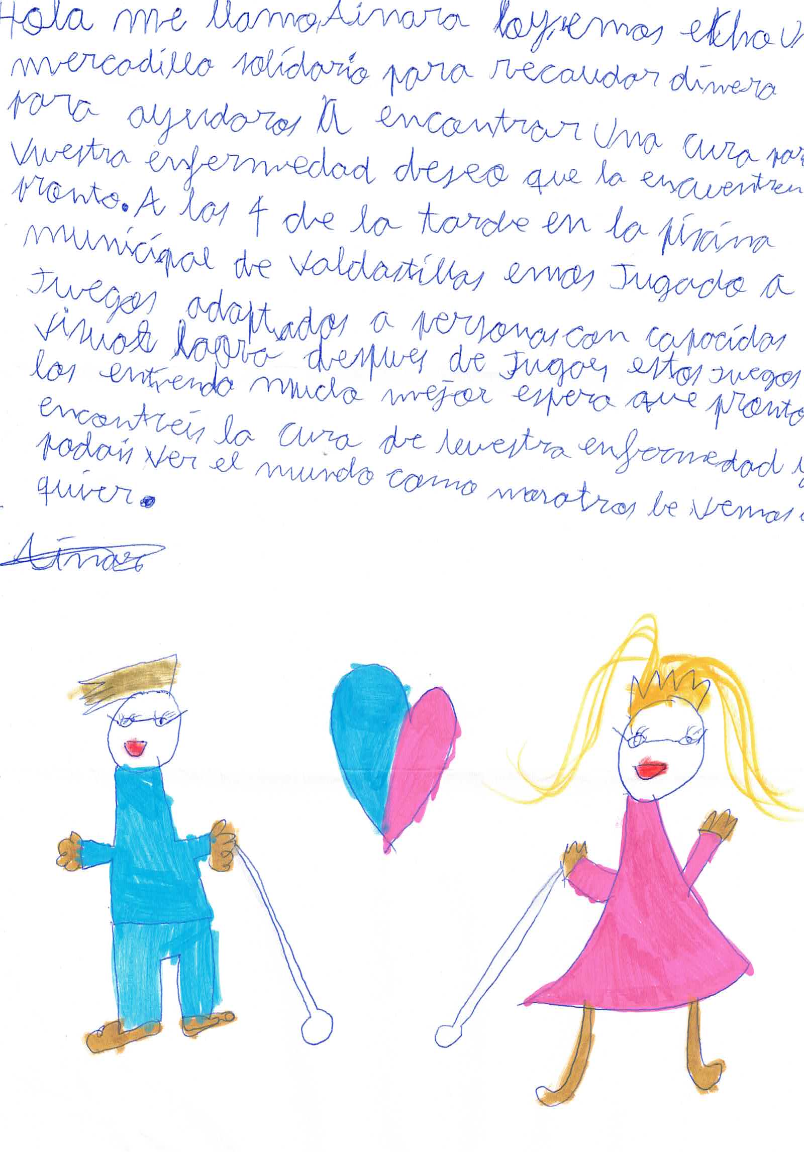 Durante esta jornada, los niños y niñas del municipio también participaron con un gesto precioso: escribieron cartas llenas de ánimo y dibujos dedicados a las personas afectadas por distrofias hereditarias de la retina. En estas cartas, se pueden ver imágenes que reflejan empatía, esperanza y comprensión: un príncipe y una princesa con bastón blanco, un ojo acompañado de una lupa, o un niño sorteando obstáculos. Algunos mensajes incluían frases tan potentes como:
