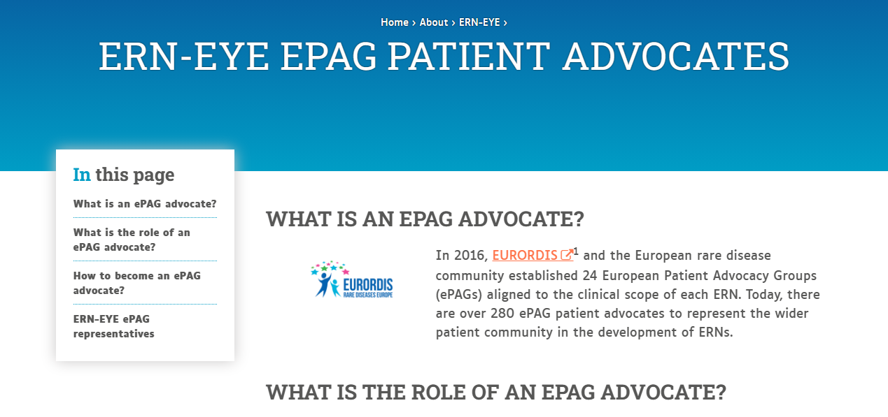 En 2016, EURORDIS y la comunidad europea de enfermedades raras establecieron 24 Grupos de Defensa de Pacientes Europeos (ePAGs) alineados con el ámbito clínico de cada ERN (Red Europea de Referencia). Hoy en día, existen más de 280 defensores de pacientes ePAG para representar a la amplia comunidad de pacientes en el desarrollo de las ERNs.