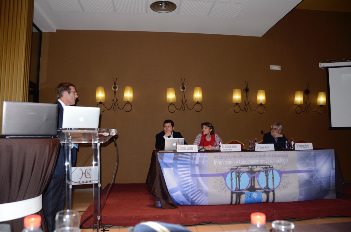 La presentación tuvo lugar en la Mesa II: Innovación en Retina, moderada por la Dra. Sánchez de la Morena, Jefe de Servicio de Oftalmología y responsable de la Sección de Retina del Hospital de Mérida, y en la que actuaban como ponentes el Dr. Francisco Espejo de la unidad de Oncología oftalmológica del Hospital Virgen Macarena de Sevilla, que nos mostró su excelencia quirúrgica en los videos de su ponencia “Novedades en el diagnóstico de imagen. Aplicaciones clínicas”. Posteriormente intervino el Dr. González González de la Sección de retina del Servicio de Oftalmología del Hospital Perpetuo Socorro de Badajoz, que expuso las “Novedades en técnicas quirúrgicas”. Posteriormente el Dr. Fernández-Burriel de la Unidad de Genética del Hospital de Mérida, presentó el protocolo y desmenuzo algunos de los aspectos del mismo junto con algunos ejemplos de los logros conseguidos gracias a la aplicación de dicho protocolo en algunos pacientes y a la inestimable colaboración y el buen hacer de los oftalmólogos de los servicios implicados. Mostró por ello su agradecimiento por la labor realizada durante la elaboración de dicho protocolo. Asímismo agradeció a los Organizadores del Congreso, la Dra. Calzado del Servicio de Oftalmología de Don Benito y al Dr. José Luis Cotallo de Cáceres, Presidente de la SEOF, y a la Dra. Sánchez de La Morena moderadora de la mesa, el haber tenido la deferencia de invitarle a presentar dicho protocolo. Se instó a los presentes a utilizarlo y presentar ante la comisión de trabajo todas las dudas y mejoras que creyeran oportunas, ya que dicho protocolo, como todos, puede ir y de hecho irá variando y será mejorado con su uso y el avance de los conocimientos científicos.